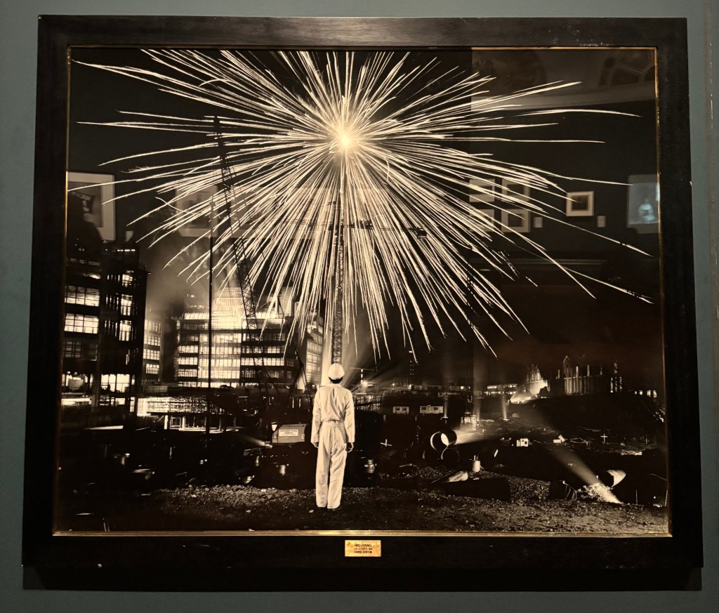 The framing centers on the figure in the center, and the firework, creating a dramatic and contemplative scene. The use of light from the exploding illuminates the scene, creating a stark contrast between the dark construction site and bright sky.
